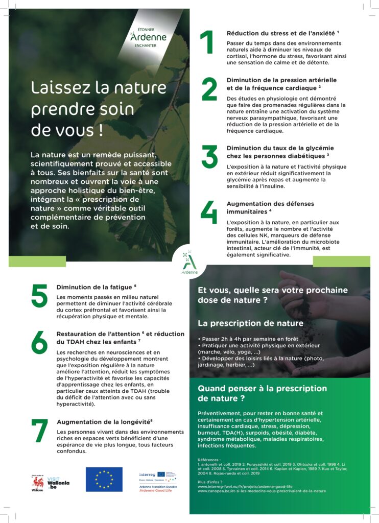 Une quarantaine de références scientifiques récentes sont proposées aux professionnels de santé pour explorer les bienfaits de la nature sur la santé physique et mentale. Présentées en fiches synthétiques avec QR code et niveau de lecture, elles couvrent liens, applications et outils. Validé par des experts, ce fonds vise à crédibiliser les soins par la nature dans le projet Ardenne Good Life.